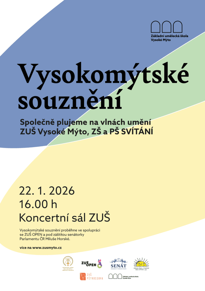 Dovolte nám pozvat Vás na tradiční vystoupení dětí bez bariér a předsudků se zdravotním postižením a nadaných žáků základní umělecké školy, nazvané Vysokomýtské souznění, které proběhne ve čtvrtek 22.1. 2026 od 16 hodin v koncertním sále ZUŠ ve Vysokém Mýtě, Jeronýmova 100.