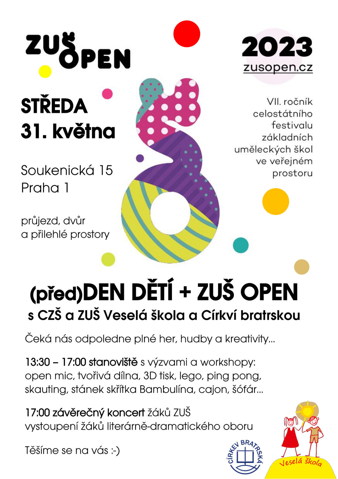 ZŠ a ZUŠ Veselá škola pořádá den dětí spojený se závěrečným koncertem školy. Pro děti bude připravený odpolední program s různými hrami, dílničkou a občerstvením ve venkovních prostorách. Proběhne prezentace připravovaného hudebního představení "O skřítkovi Bambulínovi". Od 17 hodin zazní v sále Modlitebny Církve bratrské koncert žáků ZUŠ.