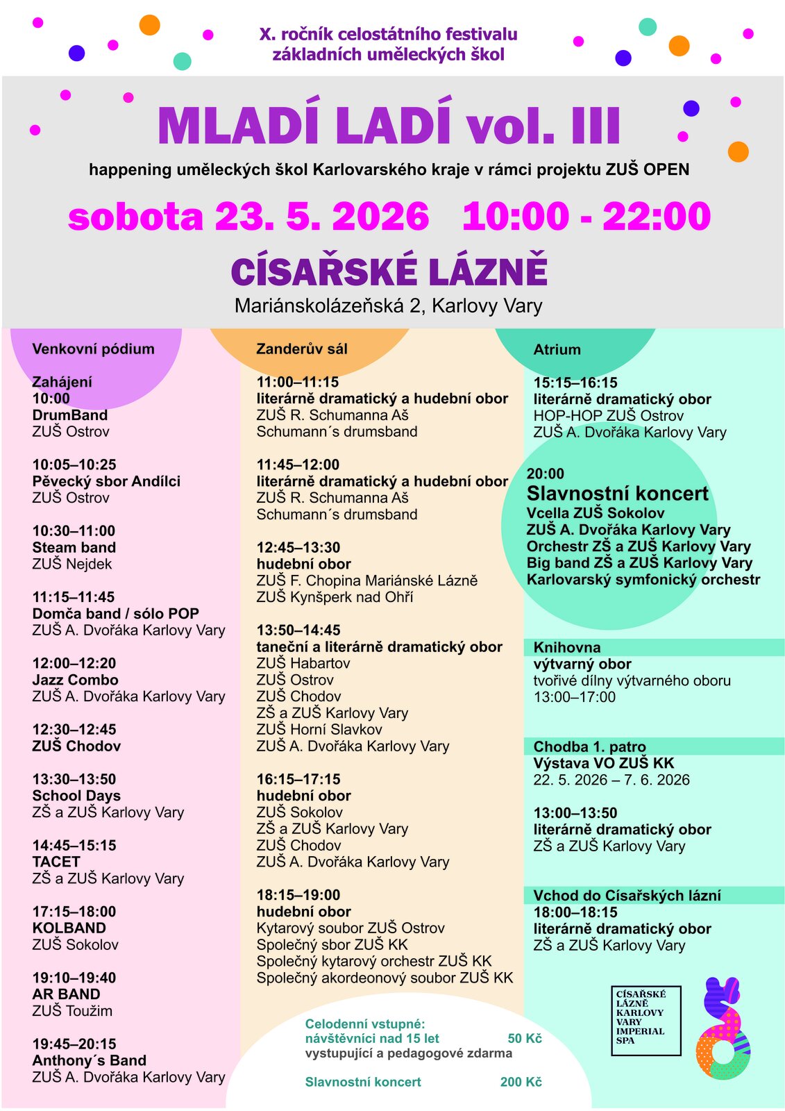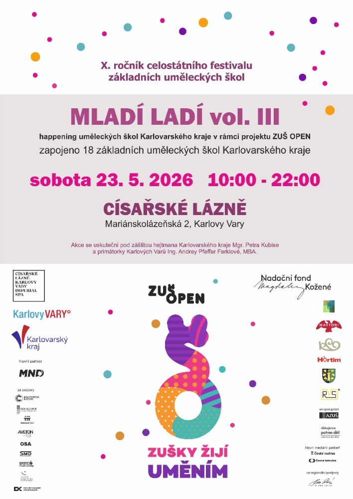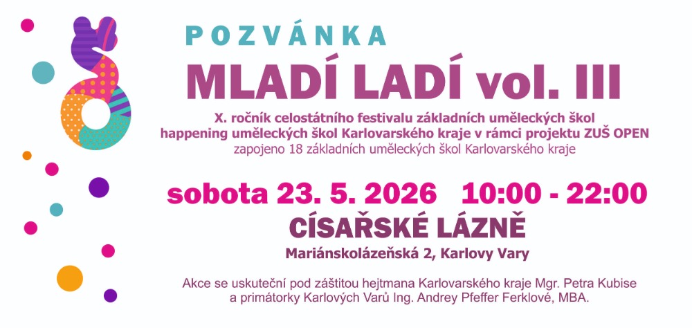 Dne 23. 5. 2026 proběhne v prostorách Císařských lázní v Karlových Varech celodenní umělecký happening MLADÍ LADÍ vol. III, kterého se zúčastní žáci a pedagogové 18 základních uměleckých škol z celého kraje.